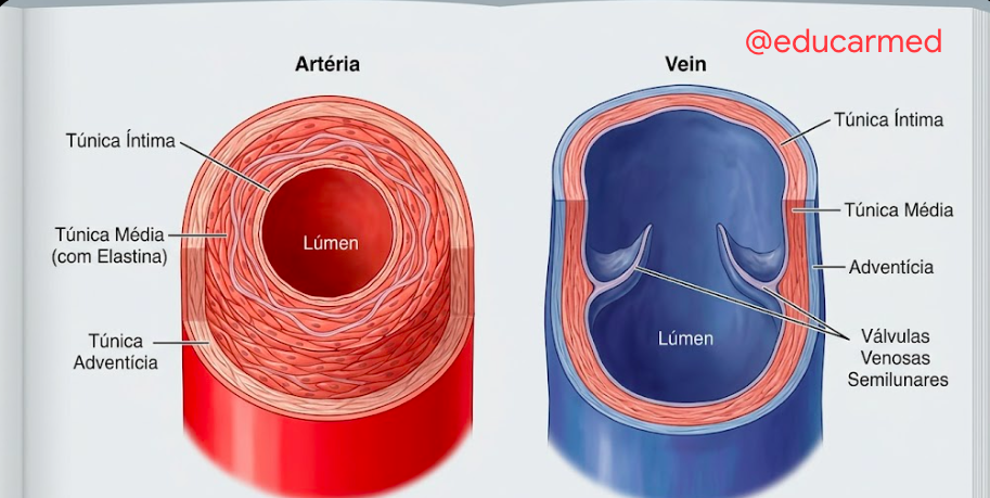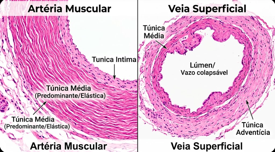 Tanto artérias quanto veias compartilham a organização estrutural básica de três túnicas: íntima, média e adventícia. No entanto, a espessura e a composição relativa dessas camadas variam drasticamente para atender às suas funções fisiológicas: